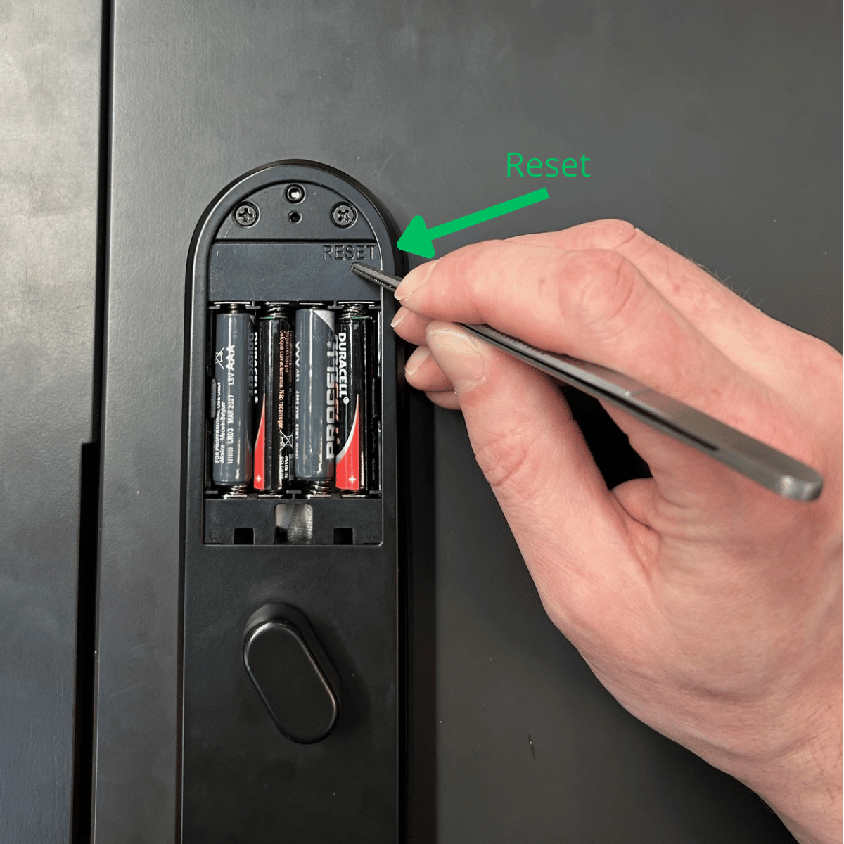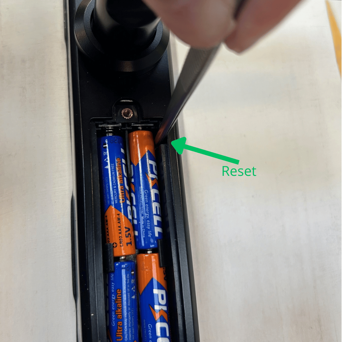 - Åbn batteridækslet og tryk på resetknappen med et lille værktøj i 5 sekunder. (Ignorer alle meddelelser i de 5 sekunder.)